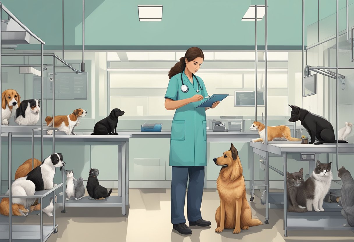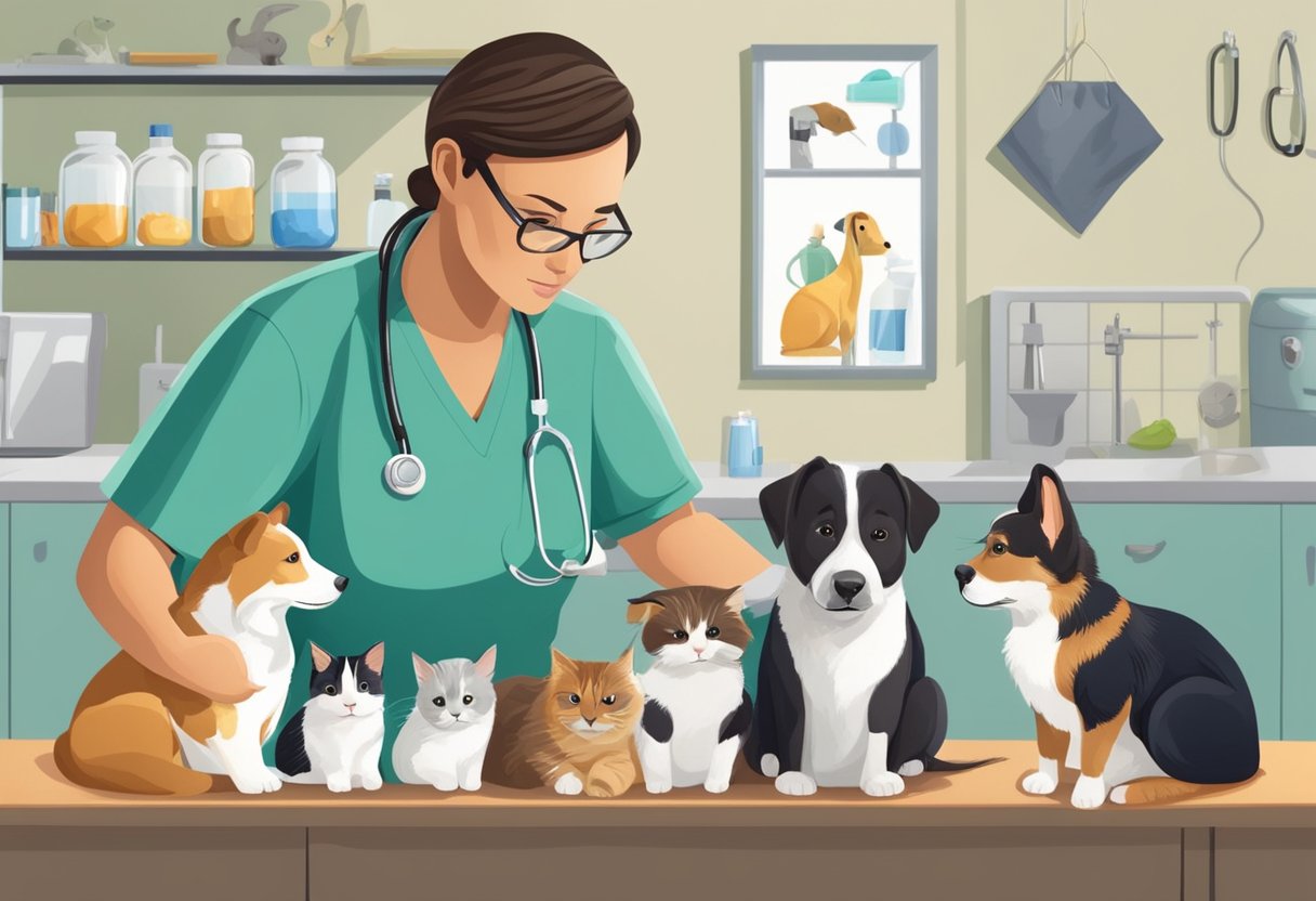 A veterinarian examining various pets with common health issues in a clinic setting