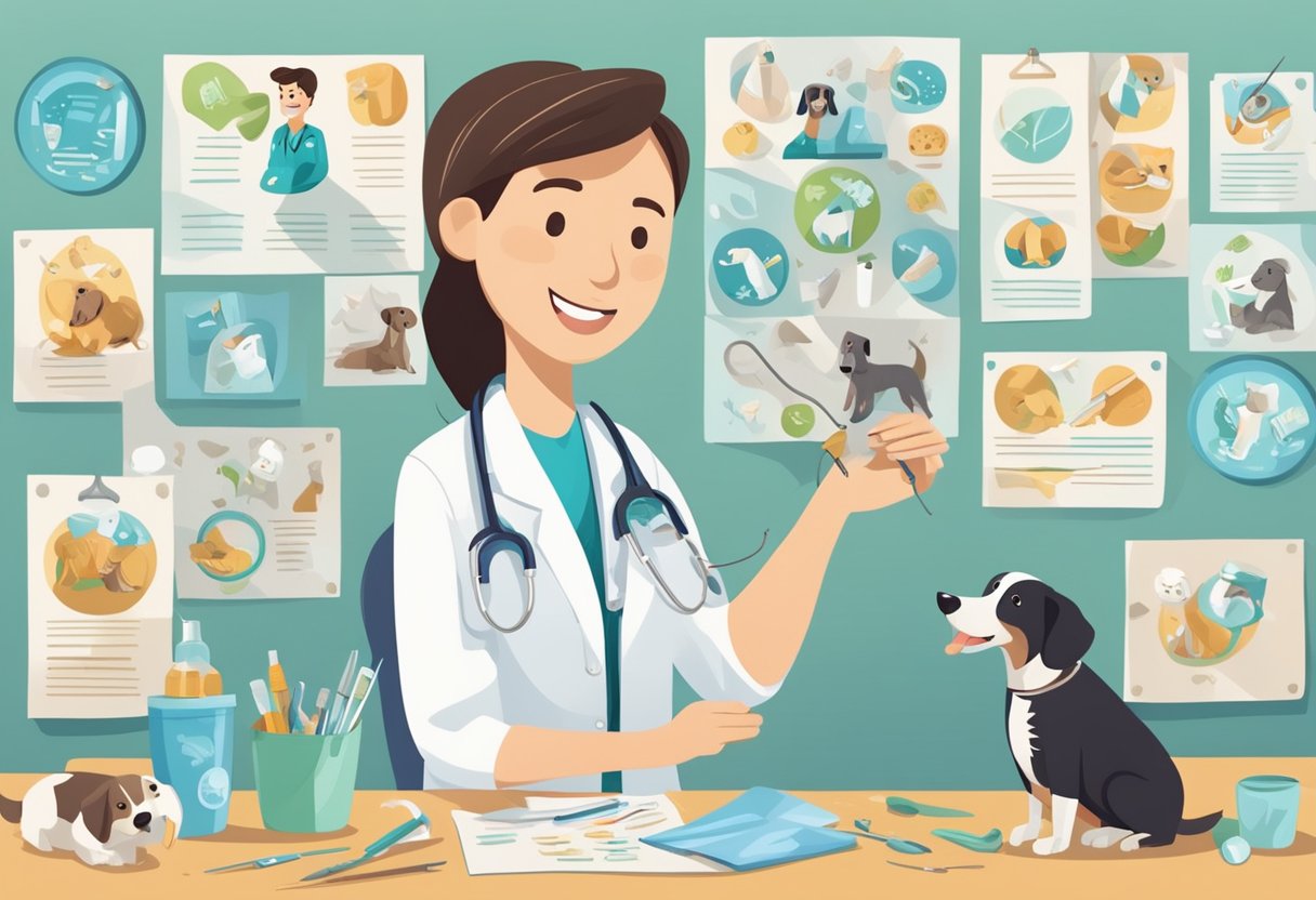 A veterinarian examining a dog's teeth, surrounded by posters showing common pet dental diseases and prevention methods