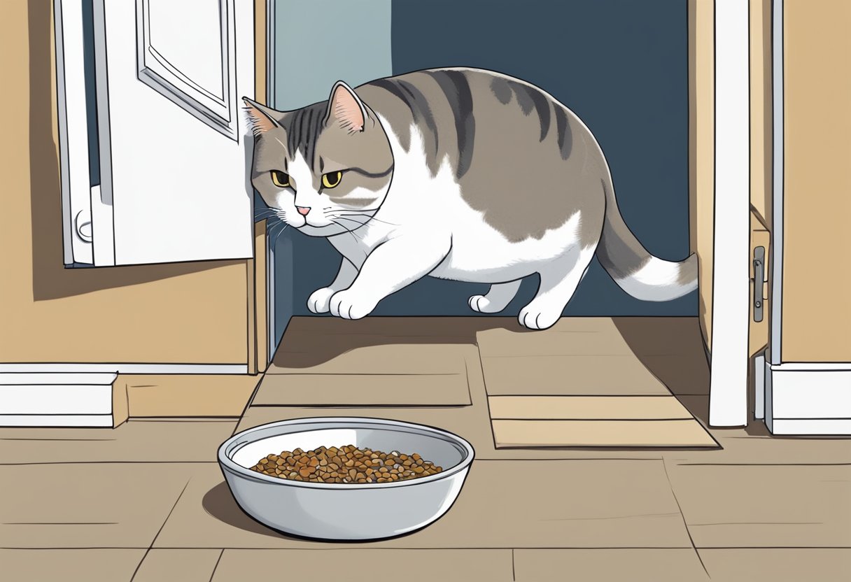 A chubby cat struggles to fit through a small pet door, while a concerned owner looks on. Nearby, a bowl of unhealthy, overfilled kibble sits untouched