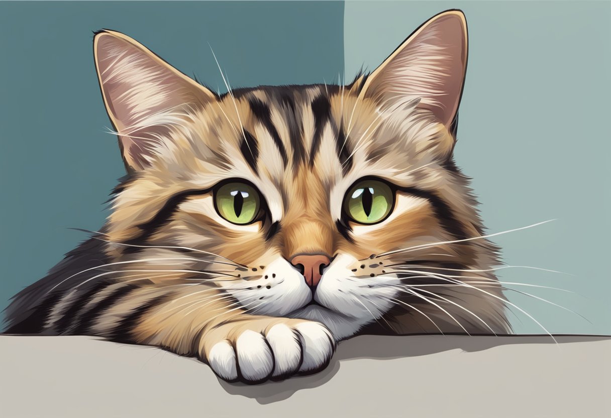 A cat laying on its side, scratching at its ear with a concerned expression on its face