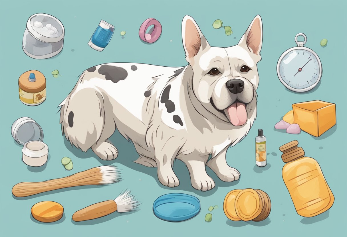 A dog with flaky skin and patches of hair loss, scratching itself, while surrounded by common pet health problem prevention items