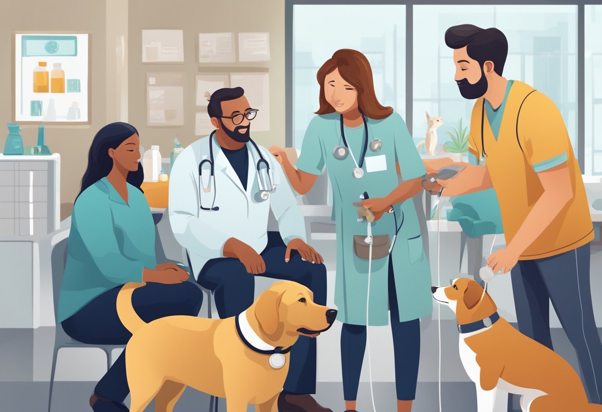 A veterinarian administering vaccinations to a group of pets while discussing preventive medications for common health problems